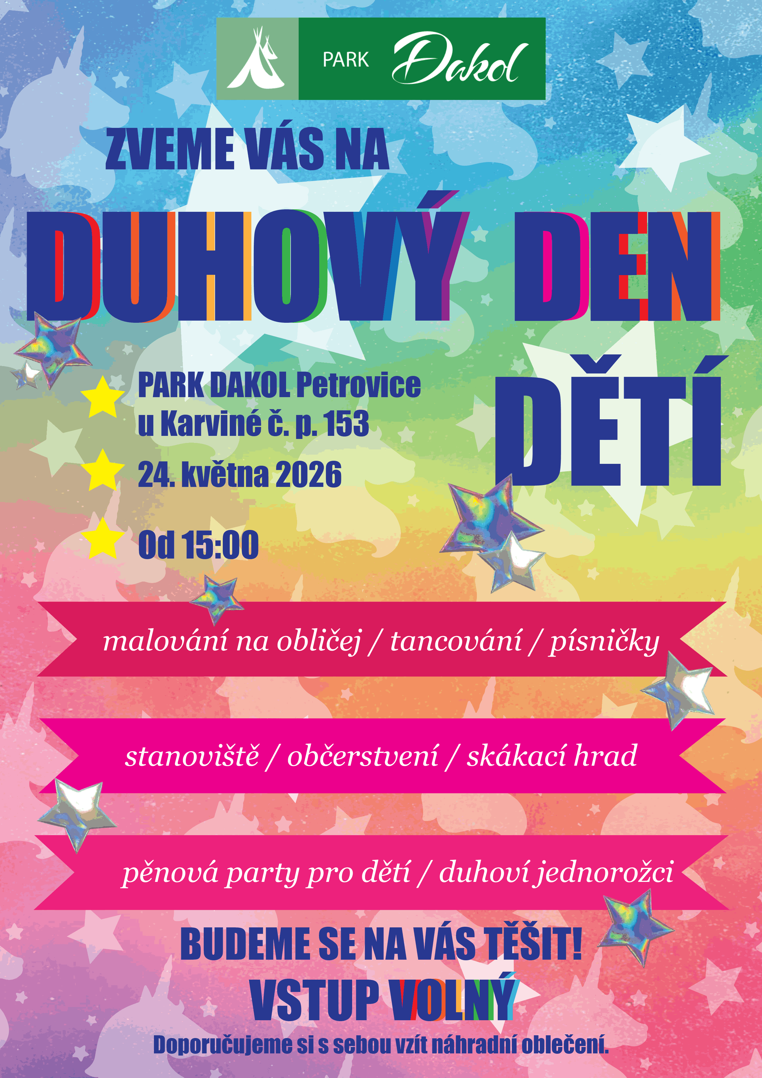 V parku Hotelu DAKOL budeme pořádat Duhový den dětí. Těšíme se na Vás. Viz příloha níže.